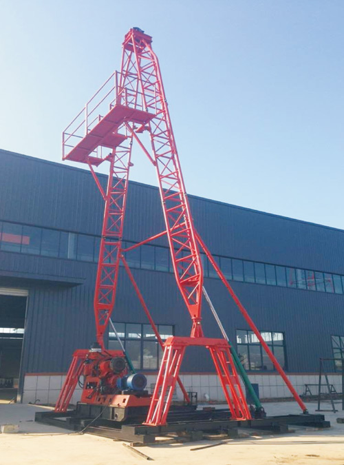 AY-13型鉆塔可配套各種水井鉆機和XY系列巖芯鉆機直、斜孔的施工。其特點為設(shè)計除具有承載能力較大、結(jié)構(gòu)合理、液壓起塔安全,拆裝、搬運成本低等特點外,顯著特點是一是塔腳跨度大(5米),操作鉆機空間大;二是塔身下塔腿鏈接鉸鏈高于底座底梁2.3米,從而在鉆機左右擺放時下塔腿不影響鉆機前后移車,鉆機動力部分可移至塔腿支撐內(nèi)檔中。也使得斜孔鉆進和提鉆過程中天車、回轉(zhuǎn)、井孔達到三點一線,大大提高了定向井孔施工的安全性。